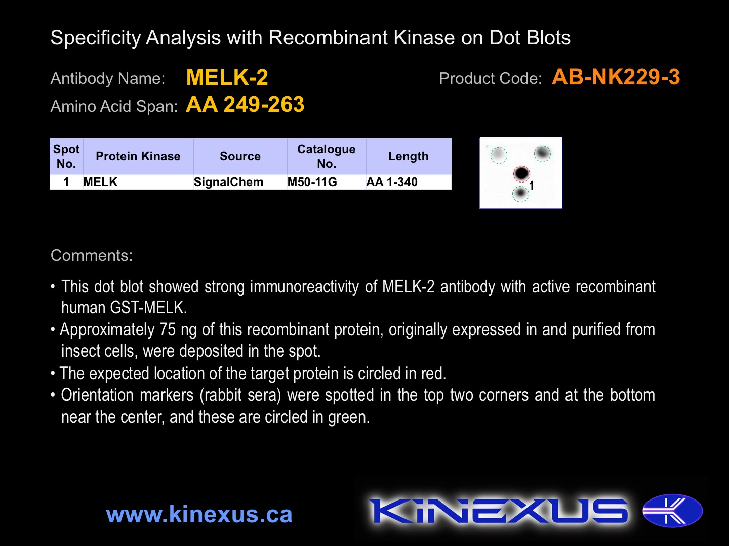 Antibody Potency: Medium-strong immunoreactivity with recombinant human MELK on protein dot blots.