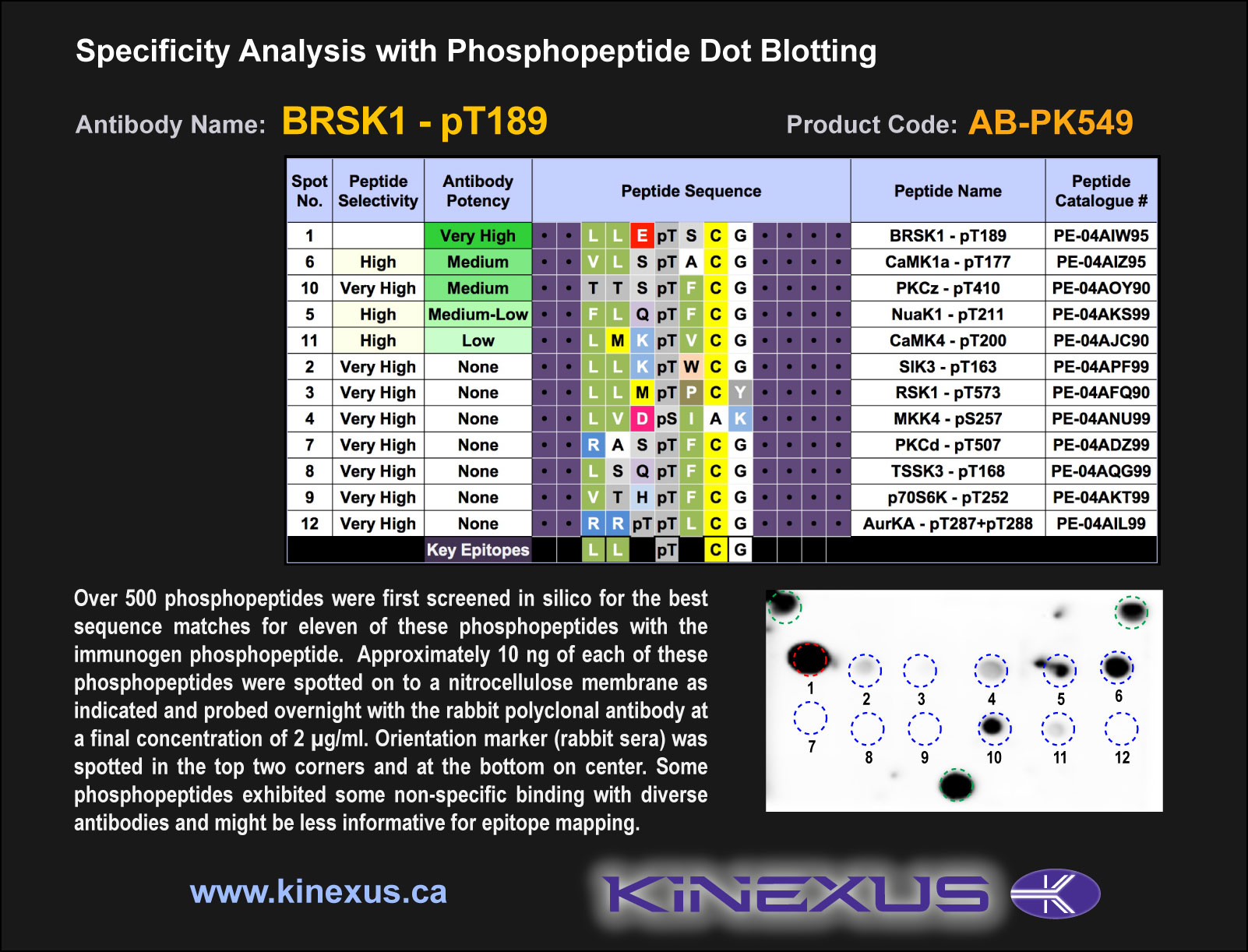 Figure 1. Epitope mapping of BRSK1-pT189 antibody with similar phosphopeptides on dot blots.