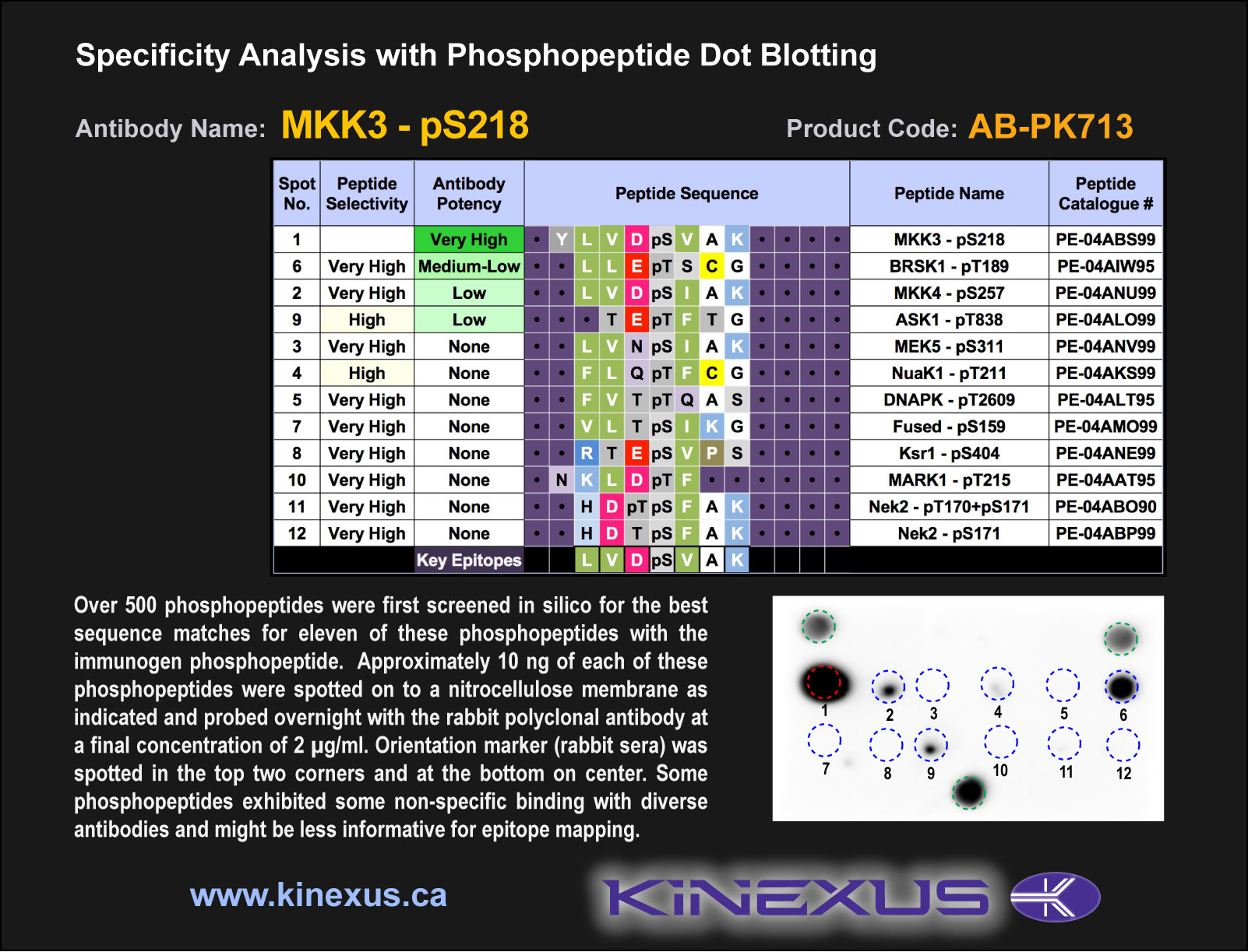 Figure 1. Epitope mapping of MKK3-pS218 antibody with similar phosphopeptides on dot blots.