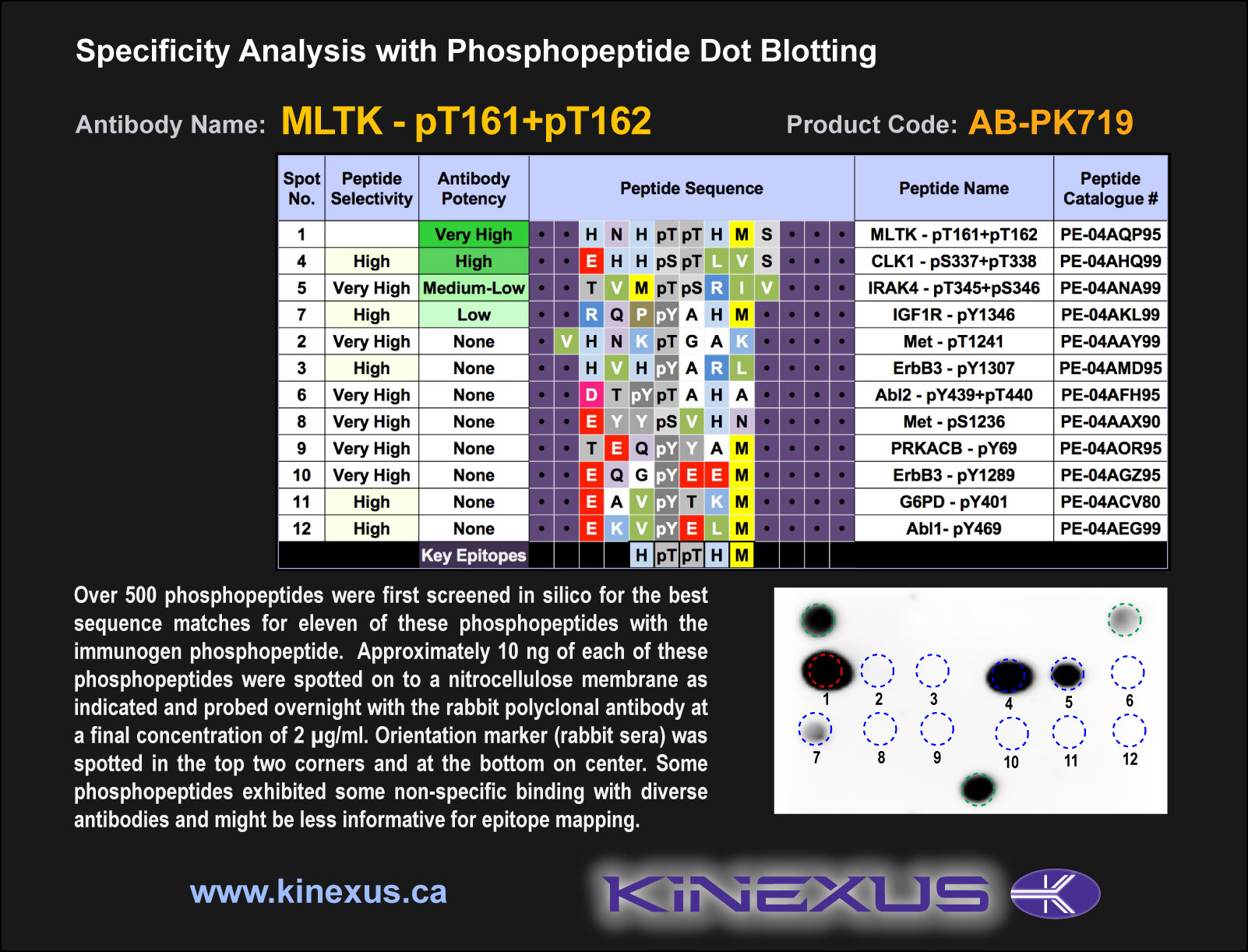 Figure 1. Epitope mapping of MLTK-pT161+pT162 antibody with similar phosphopeptides on dot blots.