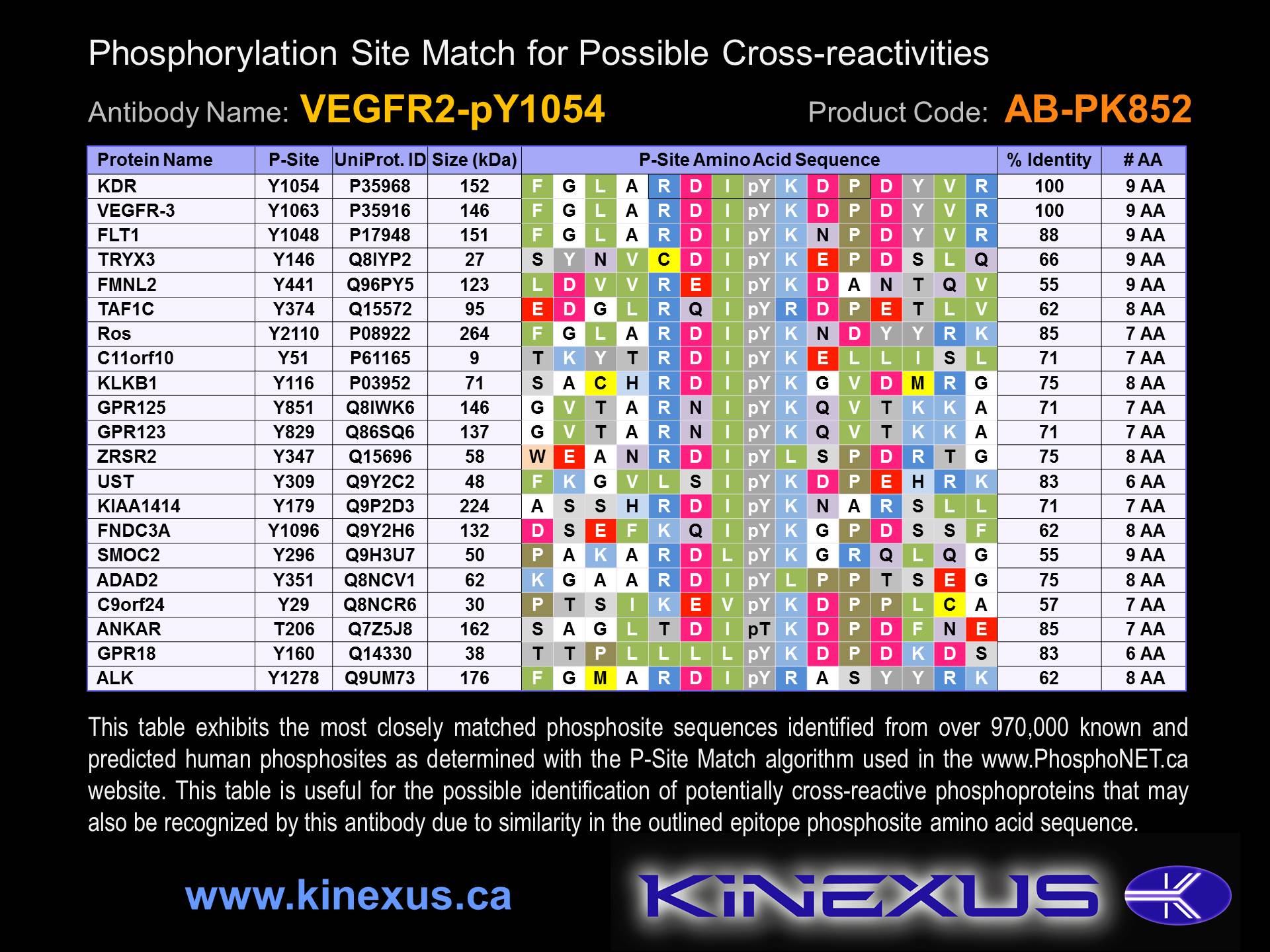 Scientific Background: VEGFR2 (KDR, FLK1) is a protein-tyrosine kinase of the TK group and VEGFR (vascular endothelial growth factor receptor) family. It is a receptor kinase that binds VEGFA, VEGFC, and VEGFD, and has an essential function in the regulation of angiogenesis, vascular development, vascular permeability, and embryonic hematopoiesis. VEGFR2 activation promotes the proliferation, survival, migration, and differentiation of endothelial cells. It is activated by binding VEGF, which induces dimerization and autophosphorylation at the following phosphosites, which all contribute to increased phosphotransferase activity. In addition, autophosphorylation of Y801 induces interaction with PIK3R1, autophosphorylation of Y951 and Y1008 induces interaction with PLCg1, autophosphorylation of Y1054, Y996 and Y1059 induces interaction with PLCg1, and autophosphorylation of Y1175 induces interaction with PLCg1, Shb, Shc1 and Shc2. KDR mediates the activation of the ERK1/2 MAP kinase intracellular signalling pathways. VEGFR2 appears to be an oncoprotein (OP). Mutations in the VEGFR2 gene have been observed in patients with hemangioma. Significantly higher VEGFR2 expression was observed in metastatic as compared to non-metastatic human colon cancer cell lines, which directly correlated with increased neovascularization and tumour cell proliferation. Elevated VEGFR2 expression was also correlated with blood vessel count in human intestinal-type gastric cancers, and in tumour cells in primary and metastatic ovarian carcinomas. VEGF signalling is vital to the early stages of tumour progression in mouse models of squamous skin tumours. In addition, inhibition of VEGFR2 resulted in tumour regression through decreased microvasculature and impaired ability to maintain the stem-like characteristic of the tumour cells.