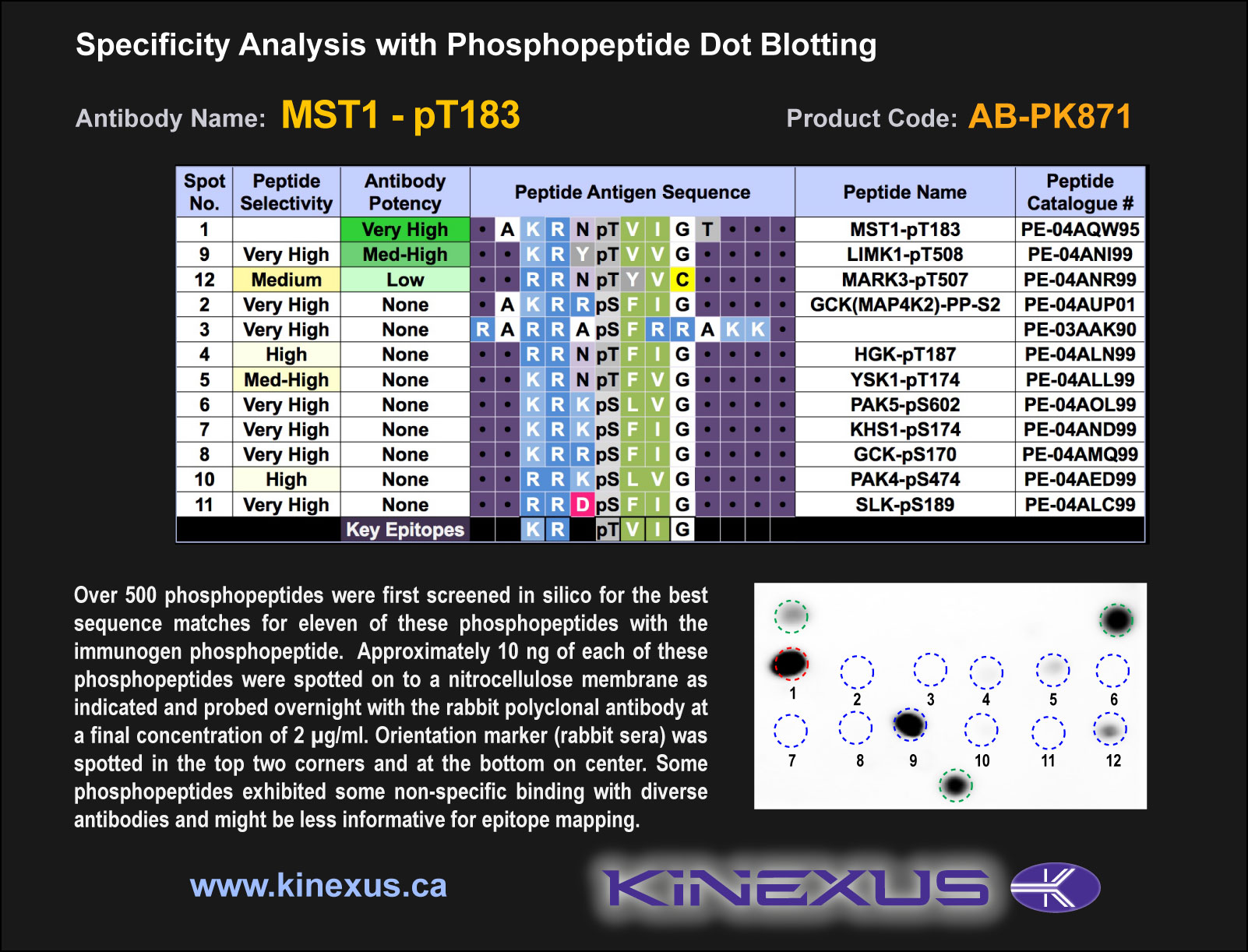 Figure 1. Epitope mapping of MST1-pT183 antibody with similar phosphopeptides on dot blots.